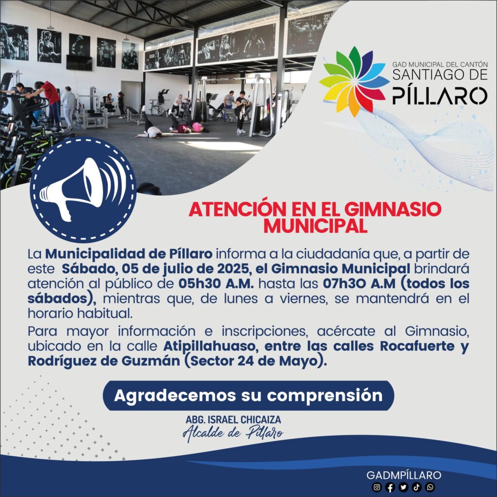 La Municipalidad de Píllaro informa a la ciudadanía que el Gimnasio Municipal atenderá también los días sábados.