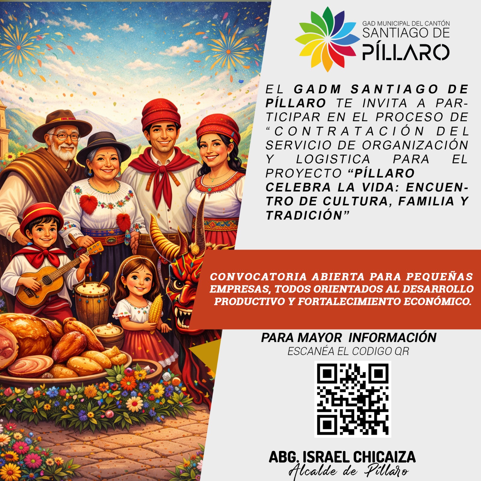 El GADM Santiago de Píllaro convoca a proveedores habilitados en el RUP a participar en el proceso FI-GADSP-2026-001 para la contratación del servicio de organización y logística del proyecto “Píllaro Celebra la Vida: Encuentro de Cultura, Familia y Tradición”, con un presupuesto referencial de $30.000 sin IVA. El proceso está dirigido principalmente a actores de la economía popular y solidaria, emprendedores, artesanos y MIPYMES, y se desarrollará conforme al cronograma establecido en el portal del SERCOP.