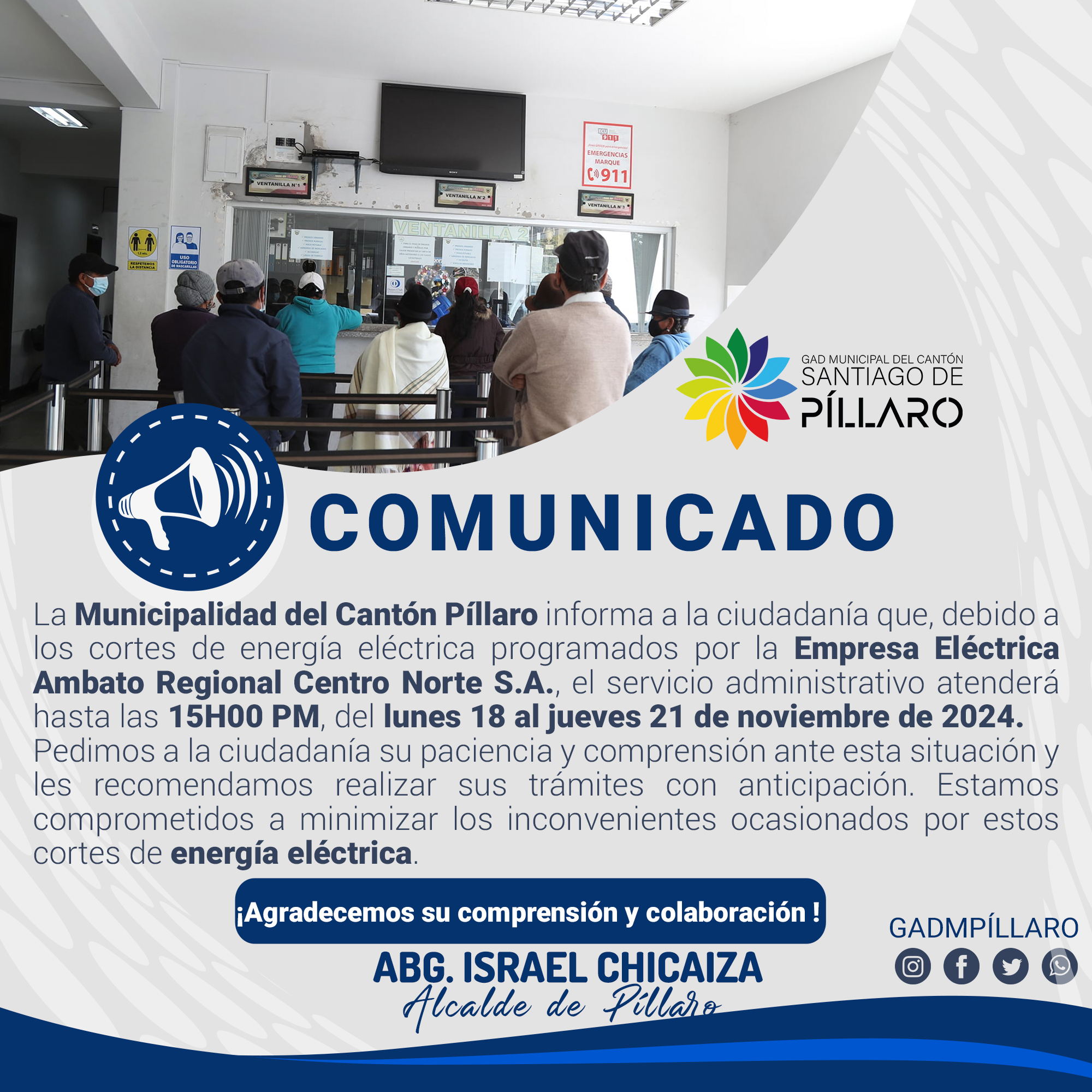 La 𝐌𝐮𝐧𝐢𝐜𝐢𝐩𝐚𝐥𝐢𝐝𝐚𝐝 𝐝𝐞𝐥 𝐂𝐚𝐧𝐭𝐨́𝐧 𝐏𝐢́𝐥𝐥𝐚𝐫𝐨 informa que, debido a los cortes de energía eléctrica programados por la Empresa Eléctrica Ambato Regional Centro Norte S.A., el servicio administrativo atenderá hasta las 15H00 PM durante los días lunes 18 al jueves 21 de noviembre de 2024.